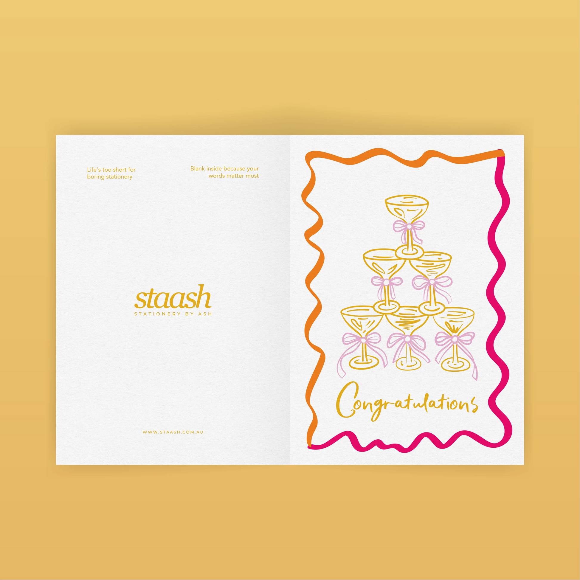 Raise a glass! This card celebrates big wins, huge news and any excuse to open bubbles. Weddings, engagements, big boss energy.